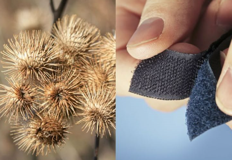 From the aerodynamic efficiency of a kingfisher’s beak influencing bullet trains to the self-cooling ventilation systems of termite mounds inspiring climate-responsive buildings, biomimicry bridges science and creativity in extraordinary ways. Perhaps the most “famous” example? Velcro – 1941, engineer George de Mestral was walking his dog when he noticed burrs (like the ones pictured below) sticking to both of them. When he studied the burrs under magnification, he found their clinging property was the result of hundreds of tiny hooks.