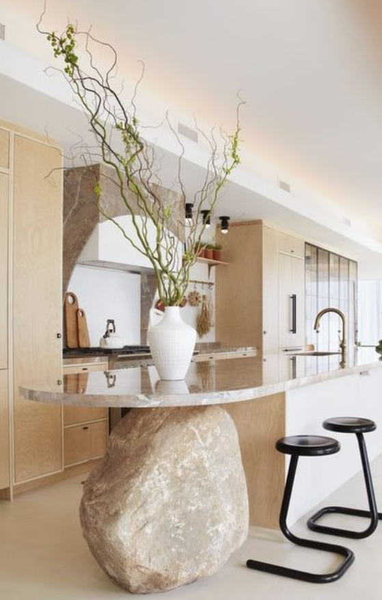 Biomimicry in kitchen design is all about taking cues from nature to create spaces that are both functional and aesthetically pleasing. By using natural materials like live-edge wood, stone countertops, bamboo, and natural fibers such as cotton and linen, designers can bring warmth, texture, and sustainability into the heart of the home. Incorporating organic shapes—like curved cabinet doors or rounded countertop edges—adds a softness that mirrors natural forms.