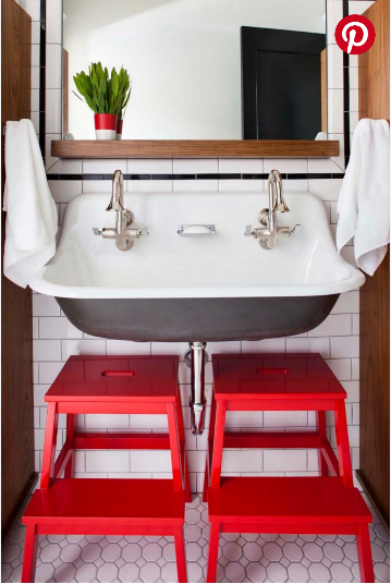 Low-standing sinks in public restrooms make it easy for little ones to wash their hands, but they’re not very practical for a home bathroom. Instead, add a step stool to help your tots reach the sink. And it doesn’t have to be a big, clunky plastic one. We love the sleek, pullout step stool that’s built into this vanity.