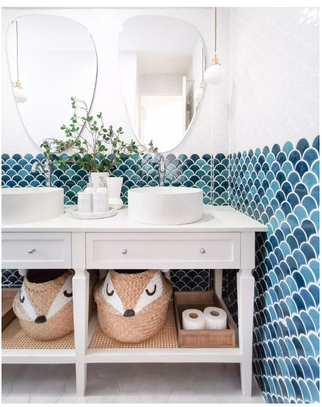 Open vanities allow for creative storage solutions, like these adorable forest animal baskets. So cute!