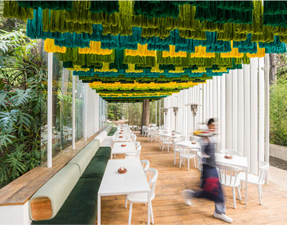 Guatemala’s traditional fabrics come from the pre-Hispanic era. Nowadays, a modern take on these traditional fabrics can be seen in pillows, quilts, and in more abstract designs, like on the ceiling of this traditional restaurant.