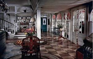 The lobby of the inn features a glass double-door entry, arched floor-to-ceiling windows, loads of white trim, columns and lodge charm. I love the checkerboard floors, white banister and decorative millwork. Every detail is so welcoming, down to the game table and round area rugs.