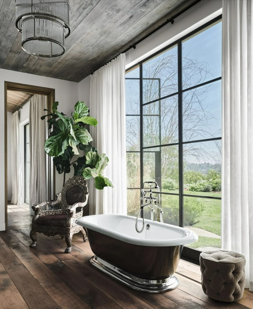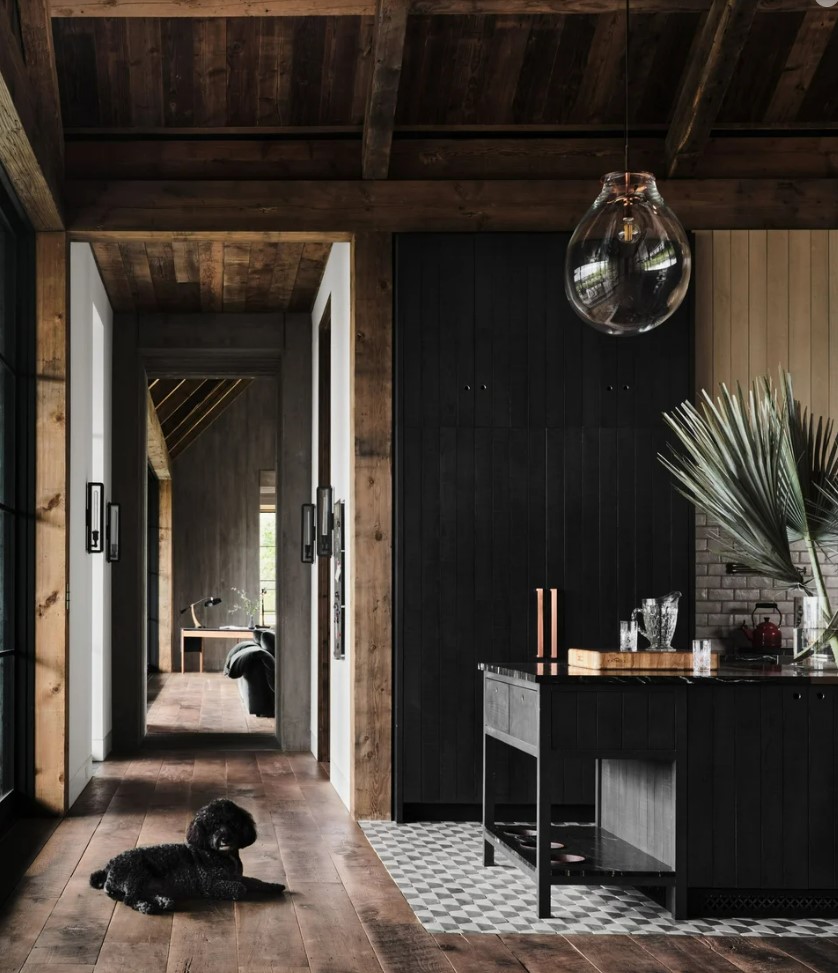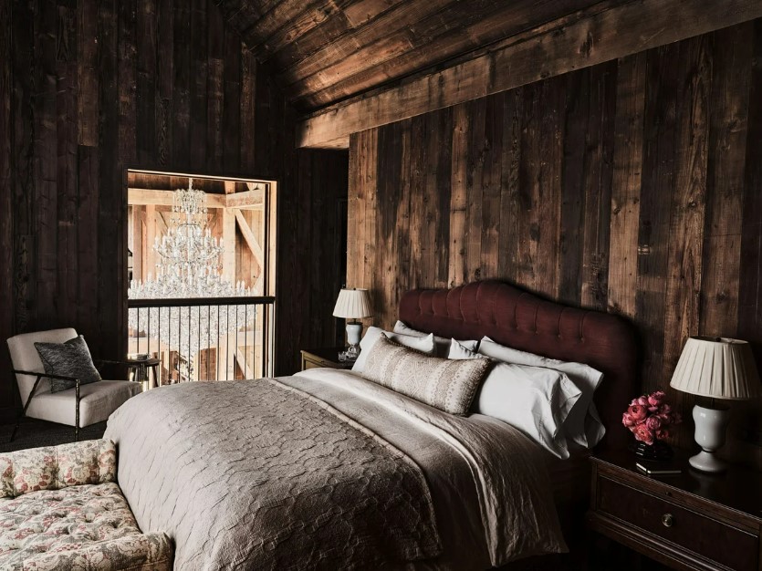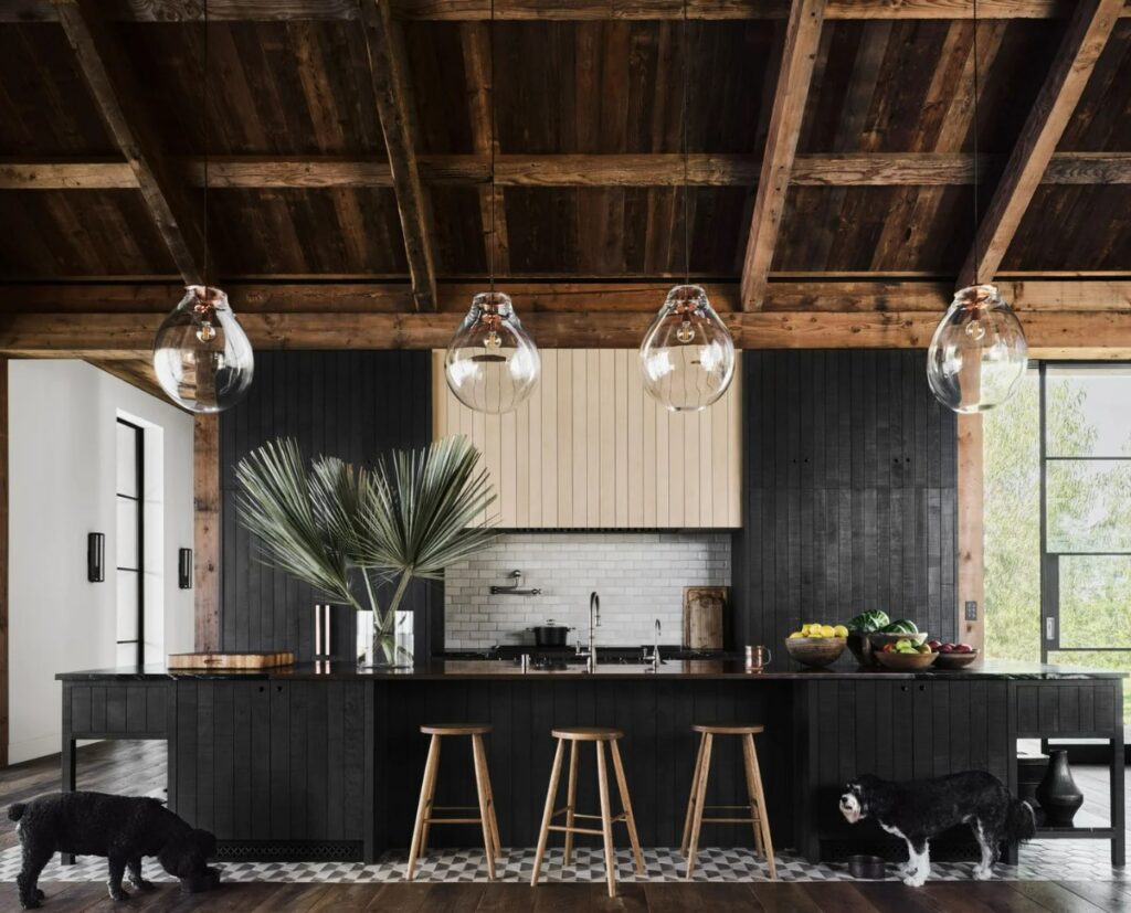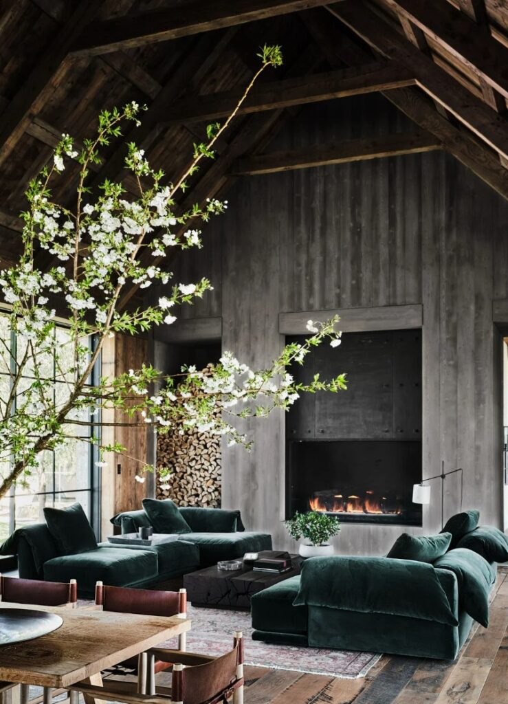 “Architectural Digest featured Kutcher’s and Kunis’s LA Farmhouse in its August 2021 issue. In fact, it made the cover. It really stuck with me, obviously, since I’m still loving it two-plus years later. The design is very “Tahoe-esq.” I love that it’s a luxury home but still casual and livable. Mixing barnwood walls with velvet upholstered pieces, creating indoor/outdoor living and juxtaposing the refined with the rugged is brilliant – elaborate elements (like an enormous formal chandelier and custom silver throne chairs) meld seamlessly within the space.” – Talie Jane, Owner and Principal Designer