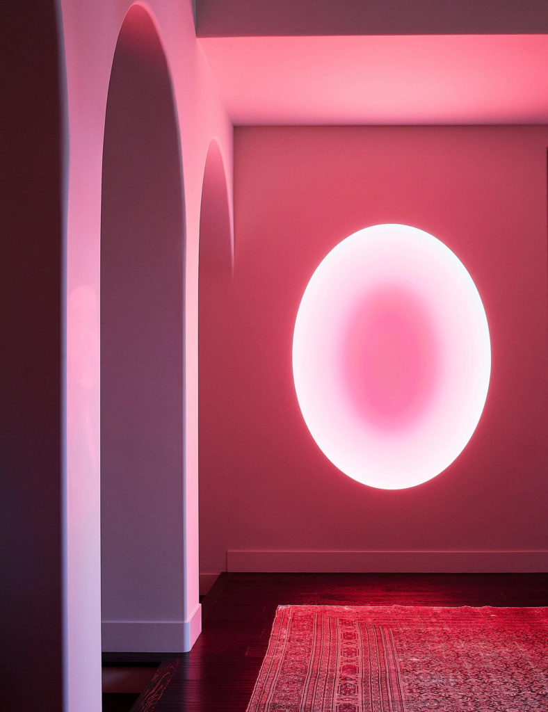 Just off the entry, a James Turrell Ovid wall sculpture, animated by computer-programmed LED lights. “I’ve always been a huge Turrell fan. I wanted this piece to a be focal point of the house.” – Jenner