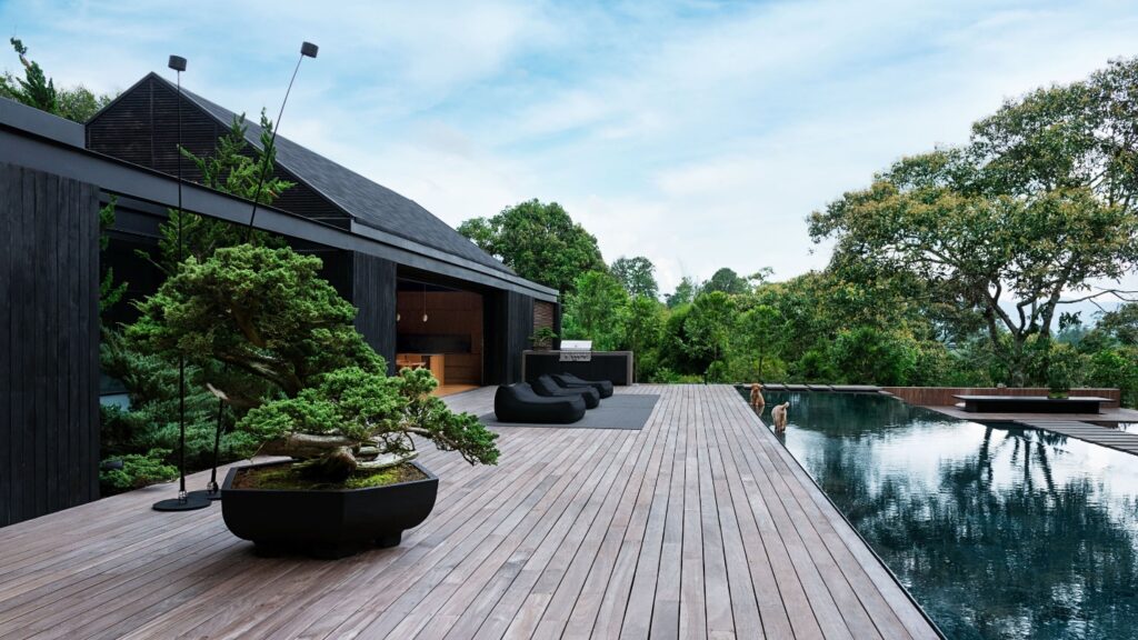 Main architectural elements are blackened wood siding and shoji-like framed doors to resemble Japanese aesthetics.
