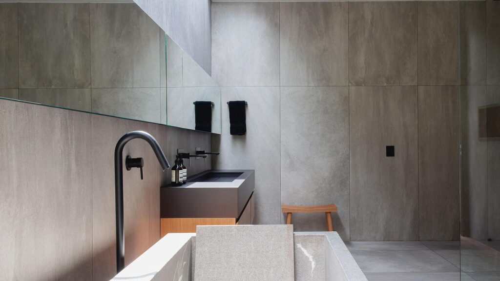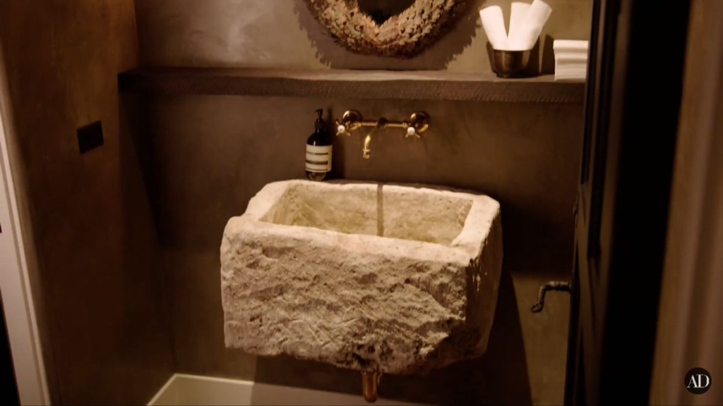 Featuring a 300lb stone sink, in a moody Aesthetic. The contractor said this was the most difficult installation of the entire home.