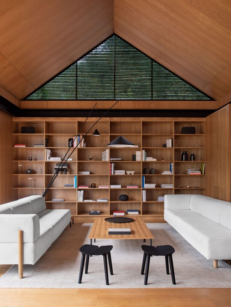 It is composed of two perpendicular volumes and a tall-pitched roof; connected by exterior beams.