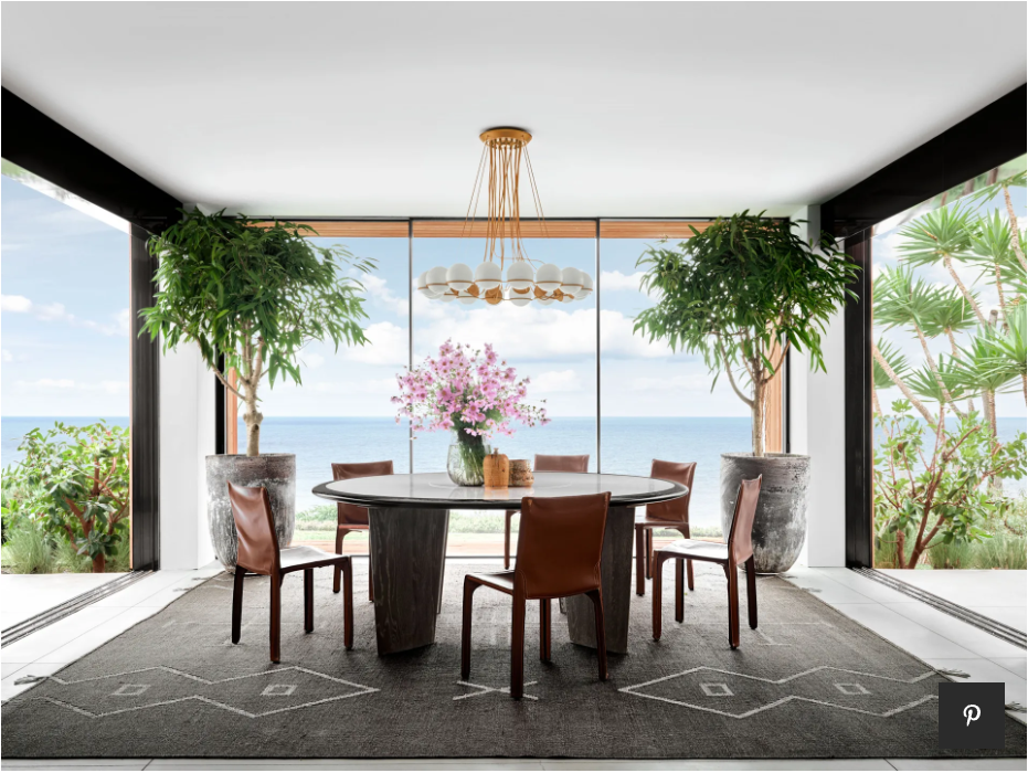 The living room design is anchored on the DeSede sofa from the 60’s with patchwork leather with the rest of the space was inspired from there. The book matched marble on the fireplace is striking & dramatic and is art-in-itself. The marble has a really nice pattern to it that mimics the ocean and is a great addition to the beach house. This book matched marble is also continued in the dining room.