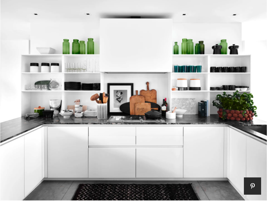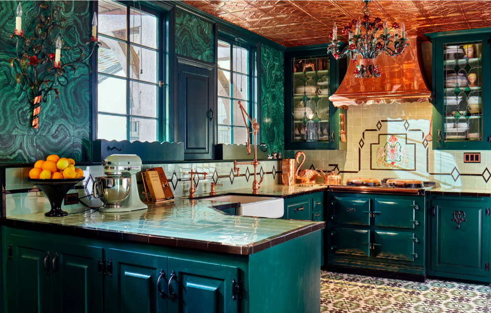 Pompeo retained the color theme of the greens and blacks throughout the kitchen.