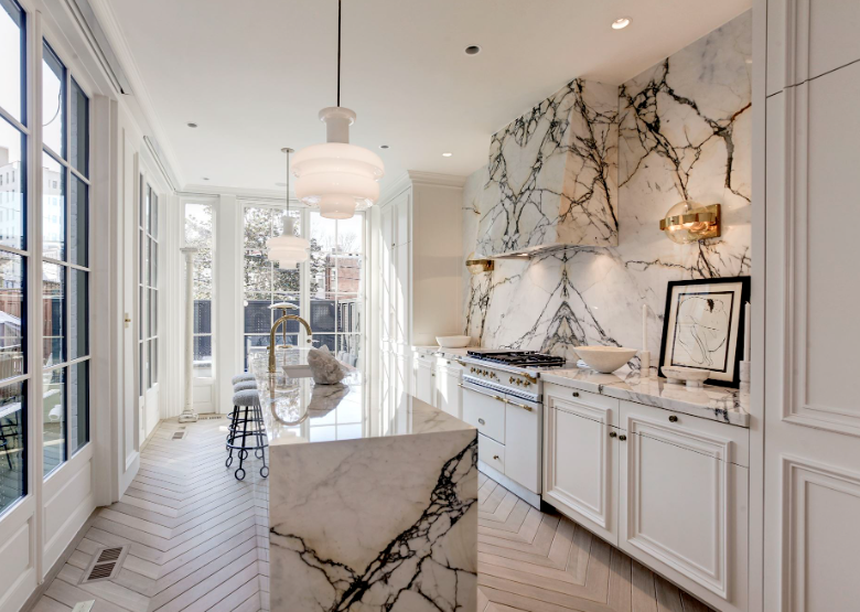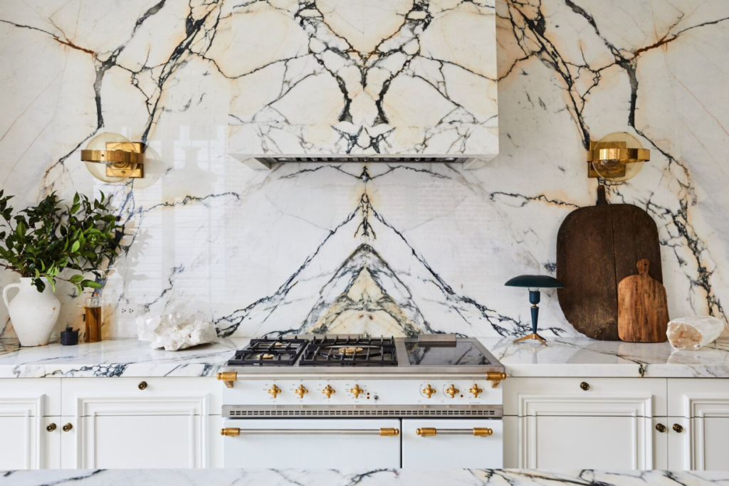 A long kitchen island, wall, and over hood made of matchbook Italian Paonazzo marble steal the show.