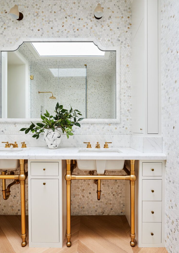 Mirror from Waterworks. Mosaic tiles by Badia Design. Vintage Giuseppe Ostuni Copper Sconces from Galerie Half.
