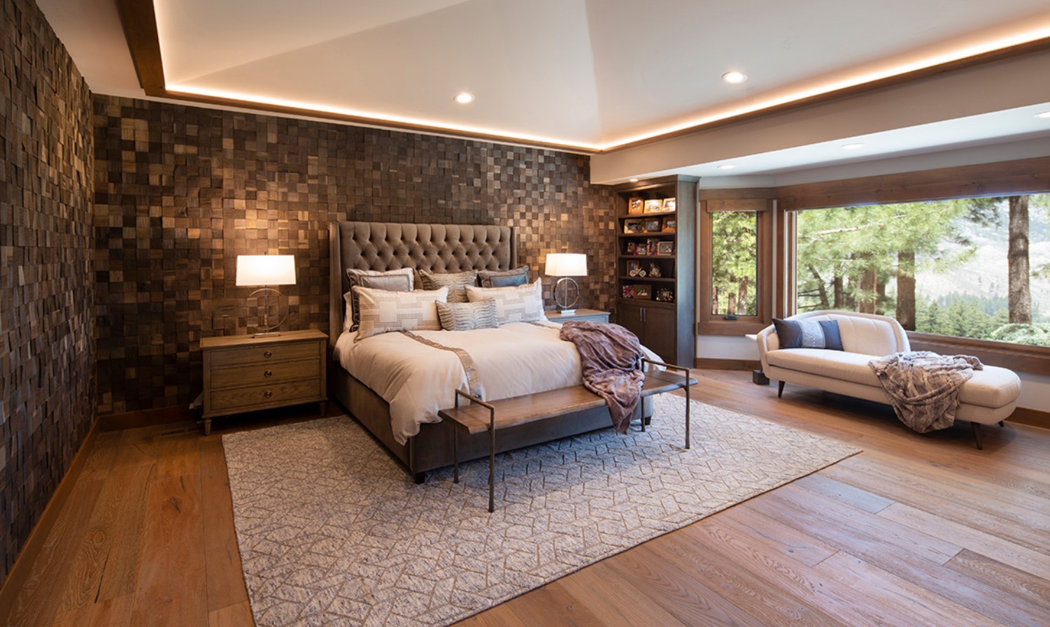 The primary bedroom was transformed into a tranquil and refined sanctuary. Out went the carpet in favor of engineered wood flooring, layered with soft area rugs to anchor the space while adding tactile comfort Houzz. A statement wood-accent wall behind the bed and tray ceiling with cove lighting lend depth and architectural character. Thoughtful additions like built-in cabinetry, custom trim work, and elevated furnishings elevate the bedroom into a restful, visually cohesive retreat that aligns perfectly with the home’s overall design vision.