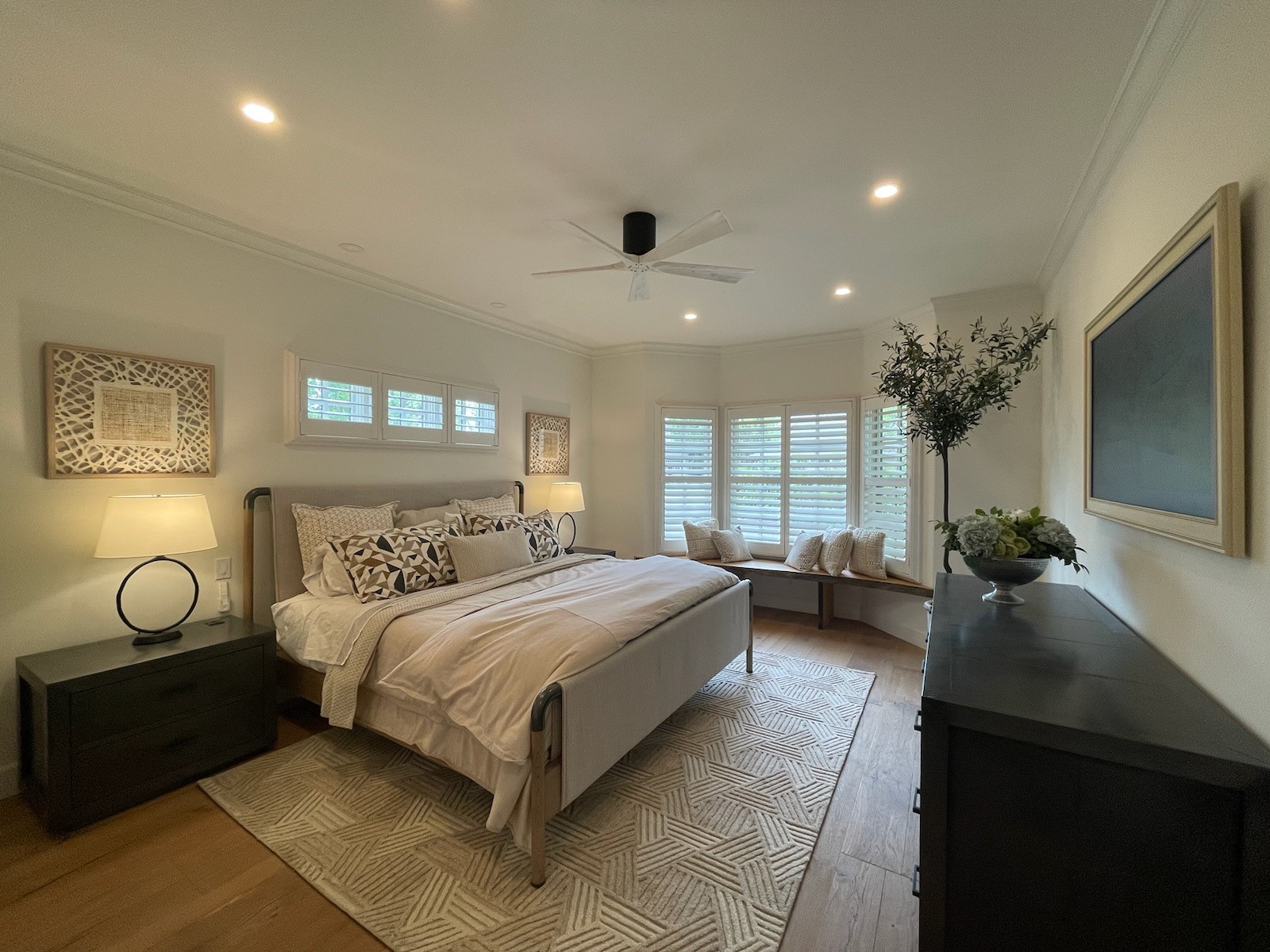 The master bedroom at Lande was designed as a tranquil and restorative sanctuary. Talie Jane Interiors established a calming design direction that blends soft, natural tones with layered textures to promote relaxation and comfort. The layout was organized to maximize natural light and facilitate ease of movement, with careful attention to proportions and balance. Statement lighting and subtle textiles were selected to reinforce a restful atmosphere, while custom furnishings and tailored details helped anchor the room’s identity as a personal retreat. The design reflects a refined yet inviting aesthetic, creating a space that feels both intimate and elevated.